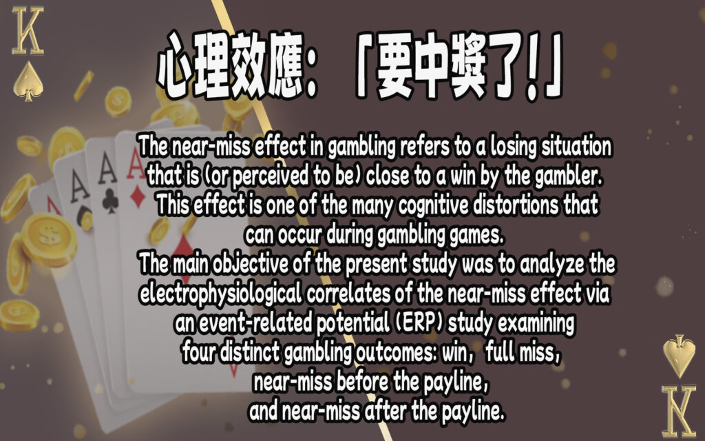 The near-miss effect in gambling refers to a losing situation that is (or perceived to be) close to a win by the gambler. This effect is one of the many cognitive distortions that can occur during gambling games. The main objective of the present study was to analyze the electrophysiological correlates of the near-miss effect via an event-related potential (ERP) study examining four distinct gambling outcomes: win, full miss, near-miss before the payline, and near-miss after the payline. (原文出處)