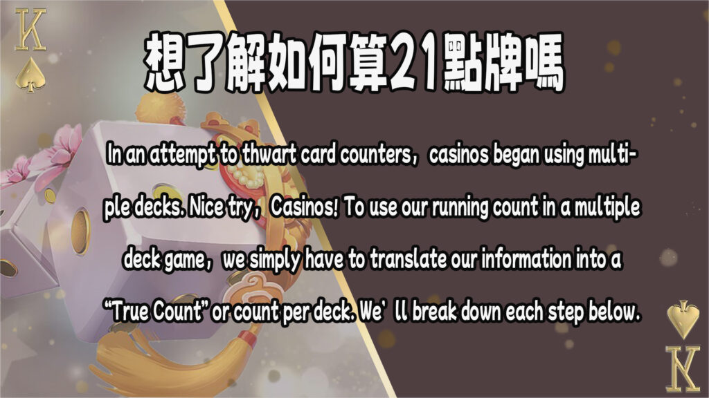 As a result, we need to calculate the true count based on the number of decks in play. We can do this by taking the running count and dividing it by the number of decks. For example, if the running count is +12 and the game has six decks, the true count is +2.(資料來源)